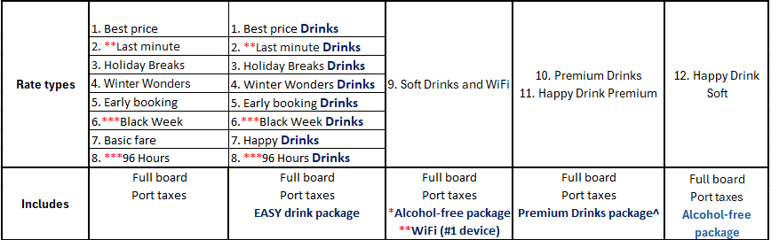 - Complete description about Drink packages (Easy, Premium, Alcohol-free, Minors) on document attached: MSC drinks packages starting Oct 2025